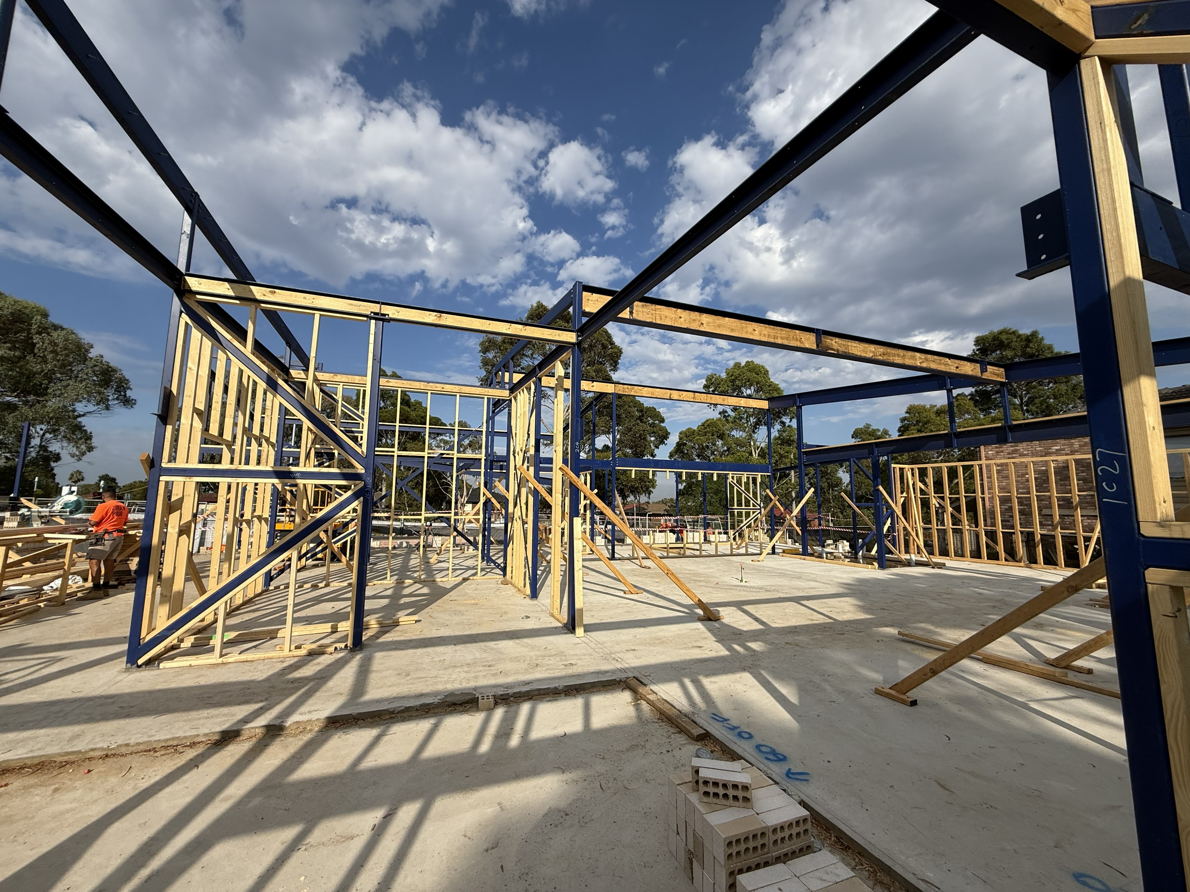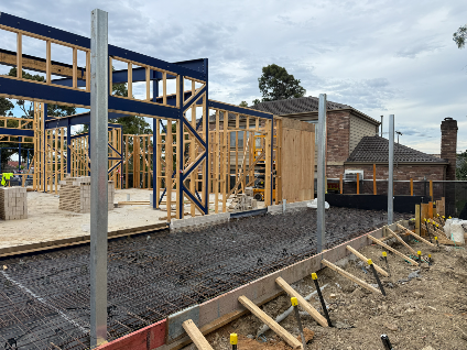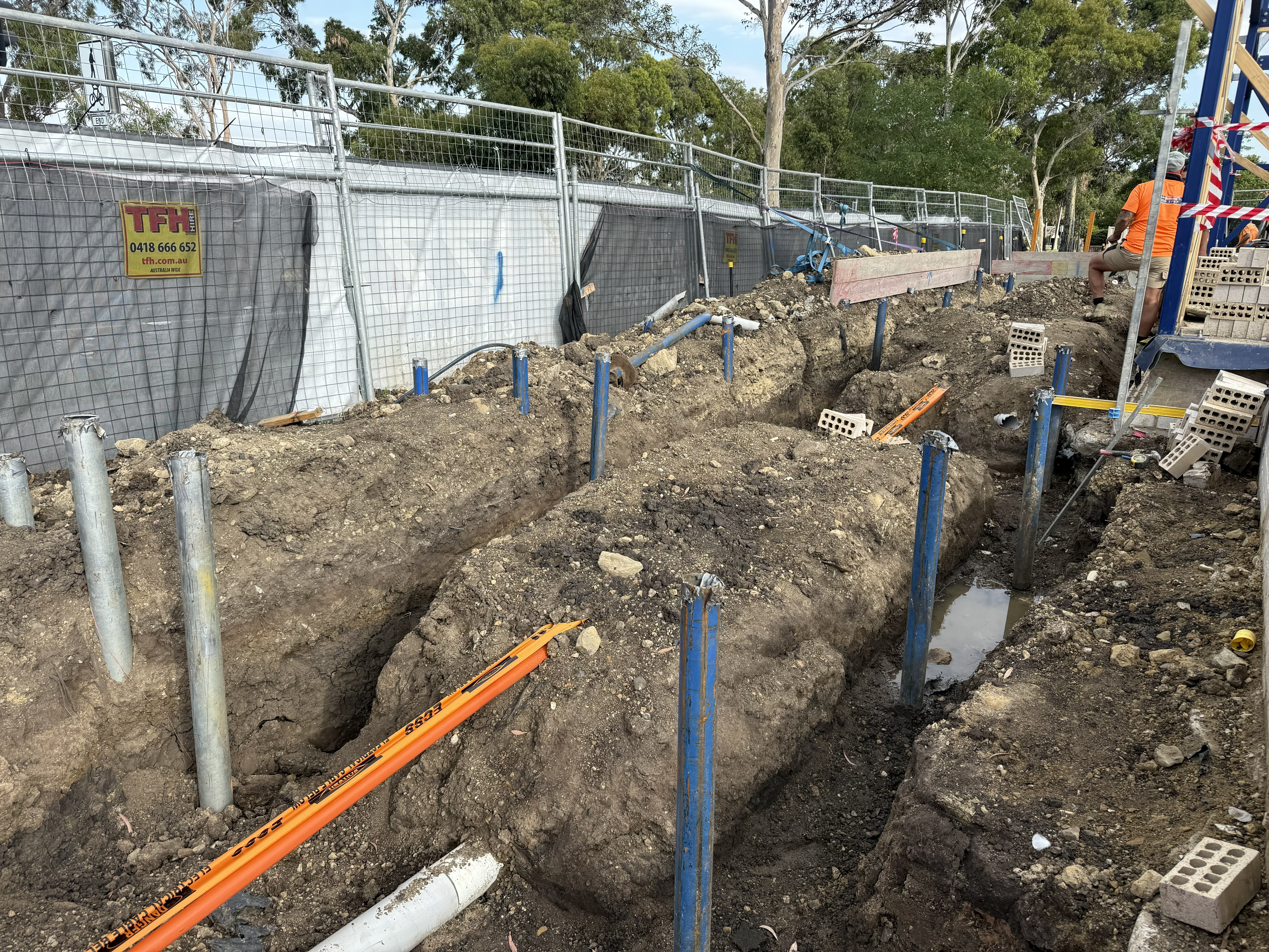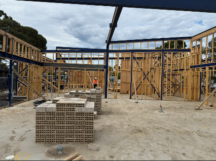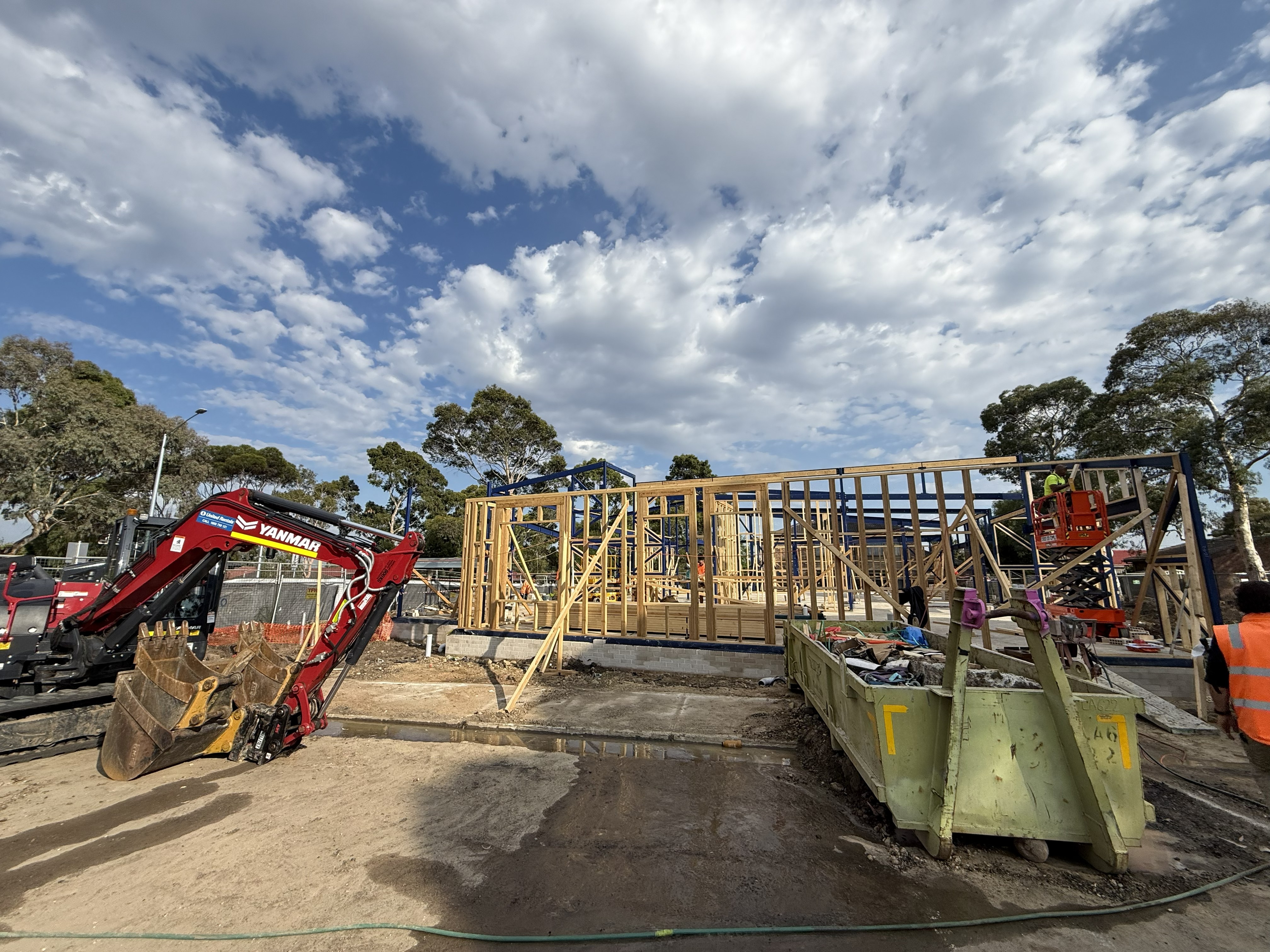 Current works include timber framing and posi‑strut fabrication, which are helping to shape the building. Crews are also excavating footings for the boundary fence retaining wall and progressing the retaining wall footing at the front of the site. In the outdoor play space, stormwater pipework installation is underway, along with service trenching across the site.
